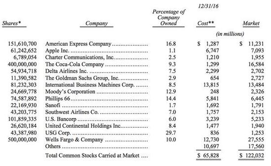 以下我们列出了截止去年年底市值最大的十五大普通股投资情况。我们没有列出在卡夫亨氏公司中的持股情况,因为伯克希尔·哈撒韦公司是控股集团的一部分,因此必须使用权益法来披露这一部分投资。