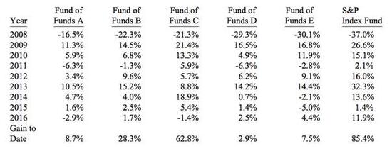 我可以确定,在任何情况下,两种基金的管理人员都是诚实和聪明的人。然而,基金投资者获得的投资收益却很惨淡,非常地惨淡。而且,其中所有基金和组合基金收取的巨额固定手续费(该手续费与基金的业绩表现完全无关),使经理们在过去9年里都能旱涝保收。正如戈登·盖柯(Gordon Gekko)所言:“手续费的收取从未停下过。”