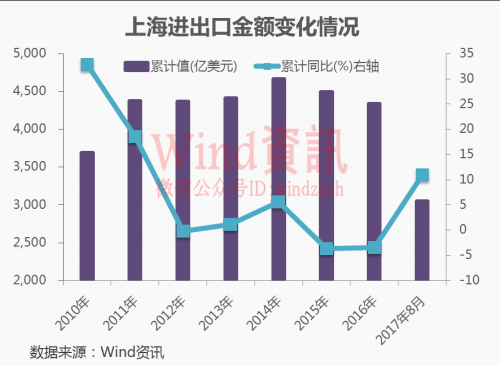 上海作为重要的贸易枢纽,近6年进出口金额均超过4000亿美元,虽然近年来增速有所下滑,但2017年前8个月,进出口金额已经突破3000亿美元,同比增长超过11%,进出口强劲复苏。