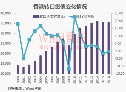 作为全球知名的自由贸易港,香港在转口贸易中占有举足轻重的地位。近十几年来,香港转口贸易货值保持稳步增长,当前已经突破3.5万亿港元,虽然近年来增速出现小幅下滑,但其江湖地位依旧稳固。