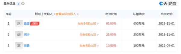 天眼查数据显示,路雷旗下公司14家,除了投资公司外,还有影视传媒公司。值得注意的是,在一家注册资本为555.56万人民币的北京中关乐影文化传媒有限公司中,路雷与上市公司神州泰岳(300002.SZ)股东及高管关系密切。根据天眼查数据,2012年,路雷与北京善聚投资管理有限公司合伙成立了北京中关乐影文化传媒有限公司,善聚投资背后股东即为神州泰岳实际控制人王宁、李力以及众多高管。