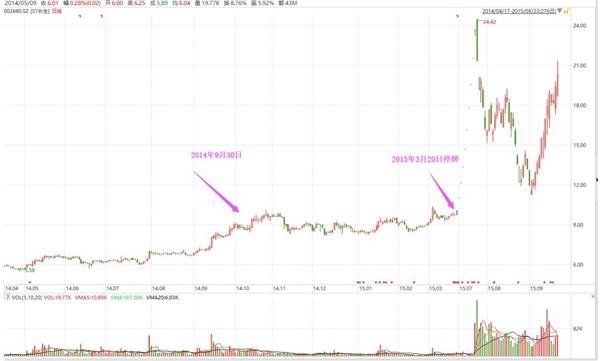 同样的方式再来一次,2015年3月20日,长生生物停牌重组,7月复牌后,连拉9个涨停板,股价飙涨136%。比照之前的精华制药,操作手法极为相似。