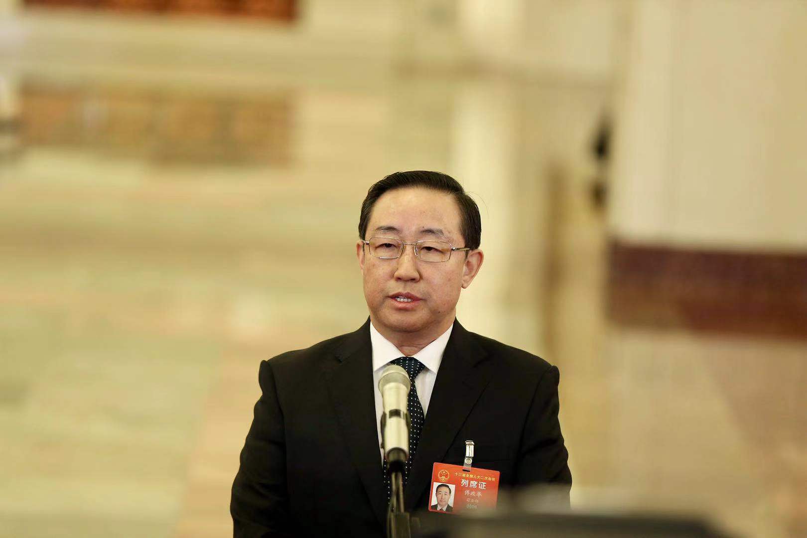 3月12日,十三届全国人大二次会议在北京人民大会堂举行第三次全体会议。图片为司法部部长傅政华在“部长通道”接受采访。中国证券报记者车亮摄影。