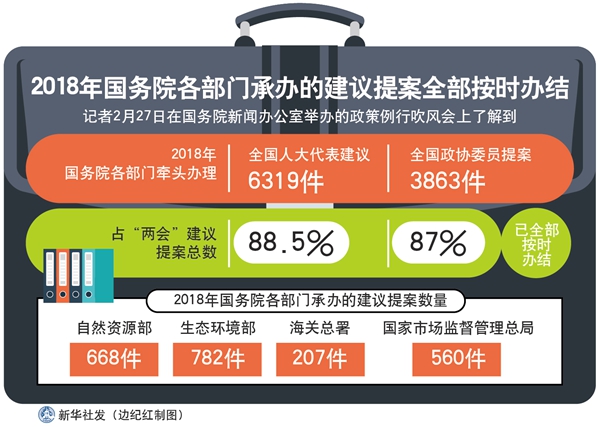 新华社北京2月27日电(胡璐、张涵)2018年,国务院各部门牵头办理全国人大代表建议6319件,全国政协委员提案3863件,分别占“两会”建议提案总数的88.5%和87%,已全部按时办结。