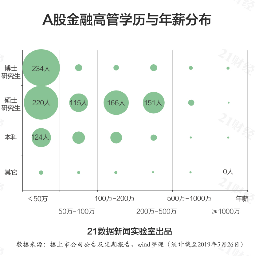 21数据新闻实验室统计发现,A股金融高管中财富百万的达659人,占比近半,其中9成来自券商及银行,保险51人,信托7人。