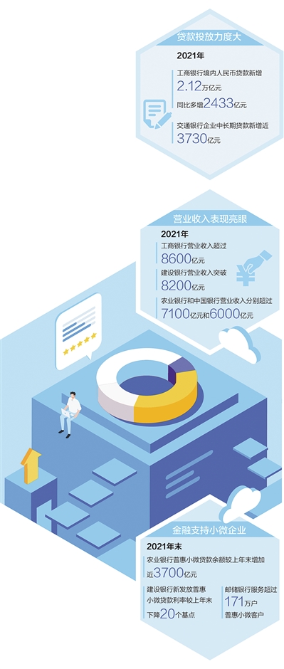 今天的信贷投放,关系着明天的经济发展。2021年,工行境内人民币贷款新增2.12万亿元;农行新增贷款2万亿元,创历史新高;建行发放贷款和垫款较上年增加1.94万亿元……大型商业银行贷款投放力度持续加大,“头雁”效应得到较好发挥。