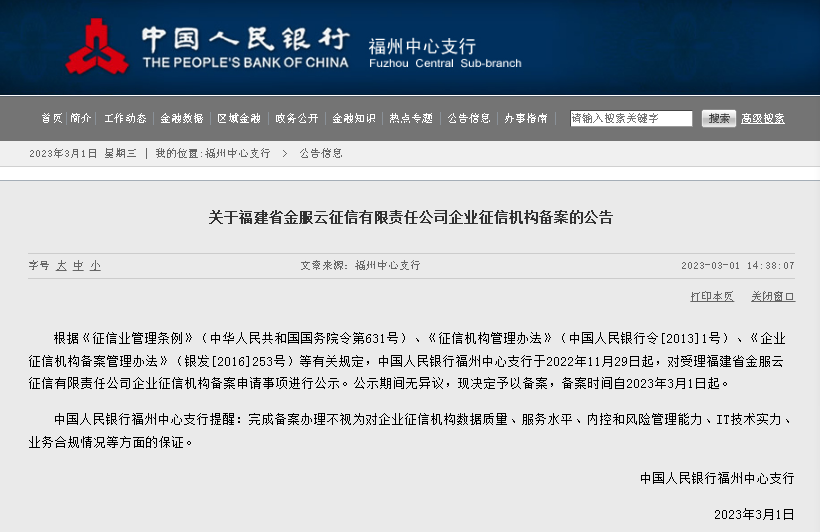 中证网讯(王珞)近日,中国人民银行福州中心支行在官网发布公告,对福建省金服云征信有限责任公司(简称“金服云征信公司”)予以备案,金服云征信公司获得从事企业征信业务及相关活动资质。