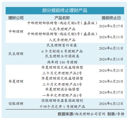 除了中邮理财和民生理财外,记者还了解到,信银理财、华夏理财、交银理财等理财公司也在6月份提前终止旗下部分理财产品。