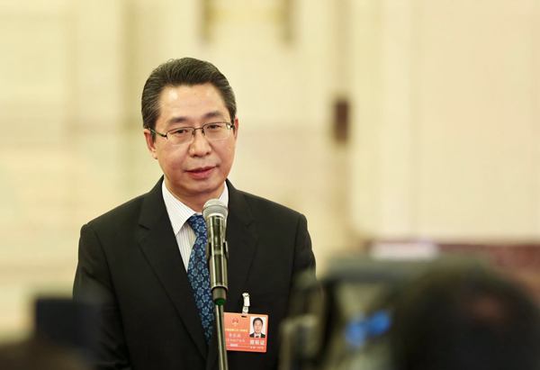 3月13日,国家知识产权局党组书记、 局长申长雨在“部长通道”接受记者采访 车亮 摄