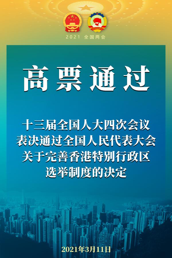新华社北京3月11日电 3月11日下午,十三届全国人大四次会议以高票表决通过《全国人民代表大会关于完善香港特别行政区选举制度的决定》。