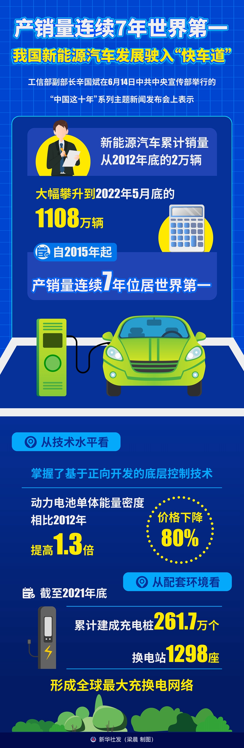 发展新能源汽车是我国从汽车大国迈向汽车强国的必由之路。党的十八大以来,我国深入实施新能源汽车国家战略,强化顶层设计和创新驱动,新能源汽车产业实现快速发展。从产销规模看,新能源汽车累计销量从2012年底的2万辆,大幅攀升到今年5月底的1108万辆。从技术水平看,掌握了基于正向开发的底层控制技术,动力电池单体能量密度相比2012年提高1.3倍、价格下降80%。从配套环境看,截至2021年底,累计建成充电桩261.7万个、换电站1298座,形成全球最大充换电网络。