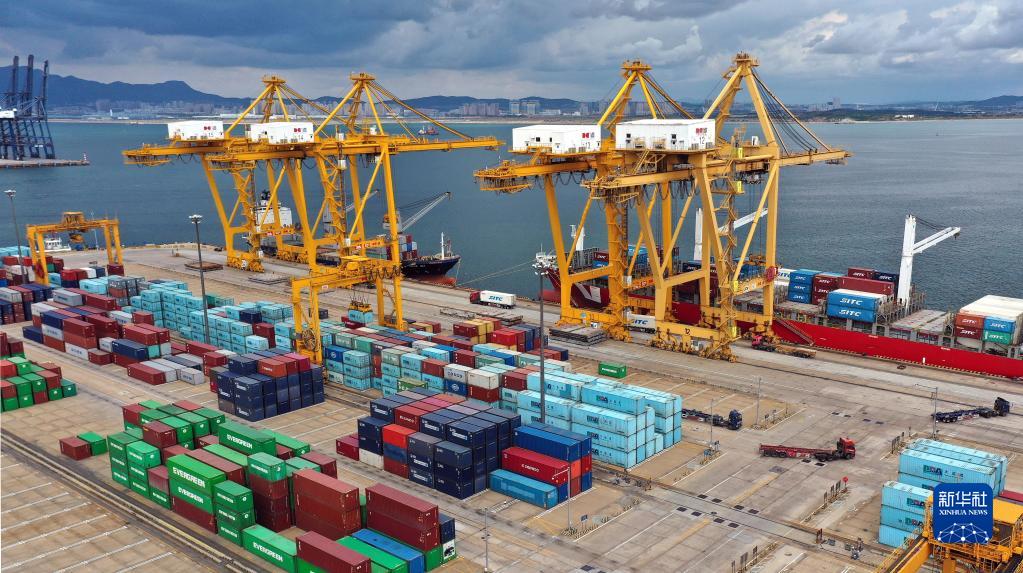 在辽宁省大连市辽宁港口集团大连港集装箱码头,货轮在装卸集装箱(2020年9月24日摄,无人机照片)。新华社记者 姚剑锋 摄