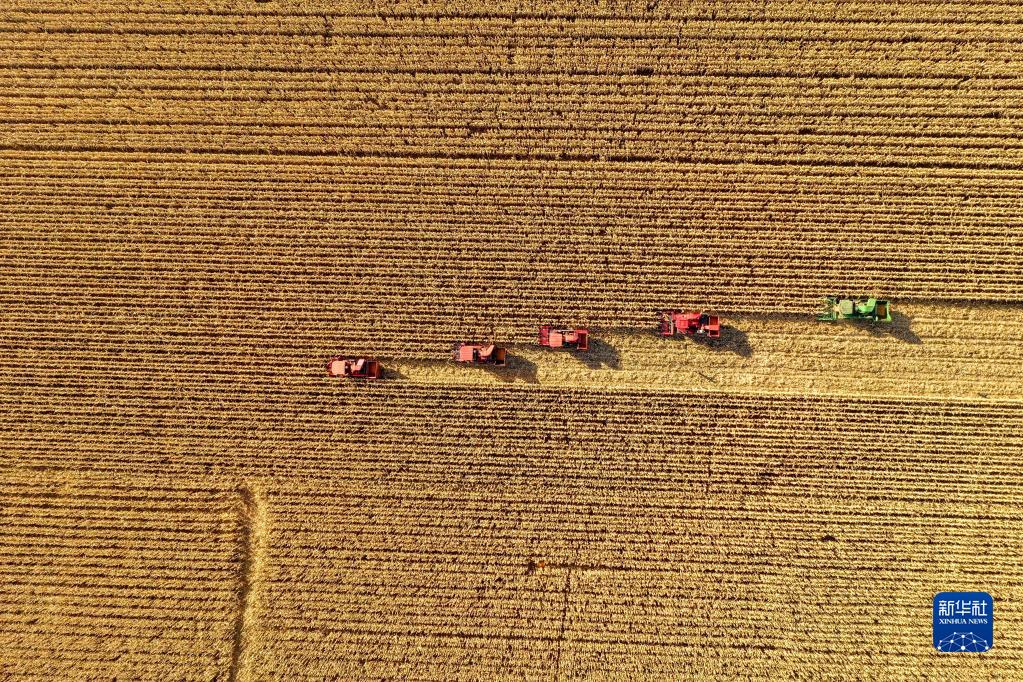 在吉林省四平市梨树县国家百万亩绿色食品原料(玉米)标准化生产基地核心示范区,农民驾驶农机进行秋收作业(2021年10月23日摄,无人机照片)。新华社记者 张楠 摄