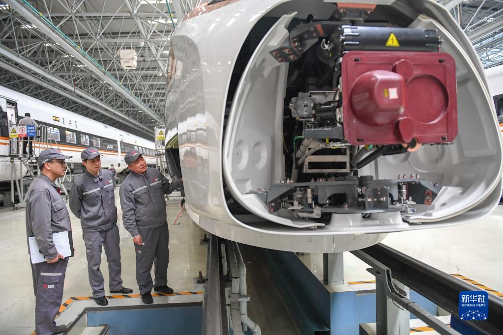 在吉林省长春市中车长春轨道客车股份有限公司高速动车组制造中心调试车间,首席技能专家罗昭强(右一)与同事检查复兴号高铁列车的电气系统(2020年11月25日摄)。新华社记者 张楠 摄
