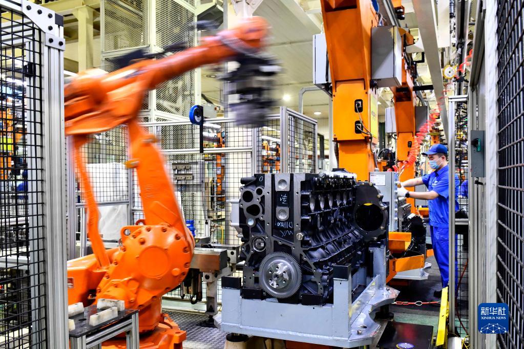 在位于山东潍坊的潍柴集团总装车间,机器人在流水线上装配发动机(2021年4月22日摄)。新华社记者 郭绪雷 摄