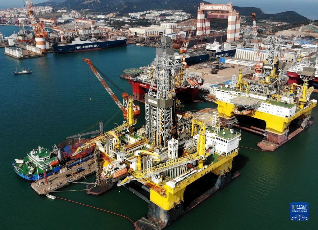 这是“蓝鲸1号”(前右)及姊妹平台“蓝鲸2号”(前左)在其生产基地中集来福士海洋工程有限公司烟台基地进行维护和保养(2021年10月18日摄,无人机照片)。新华社记者 李紫恒 摄