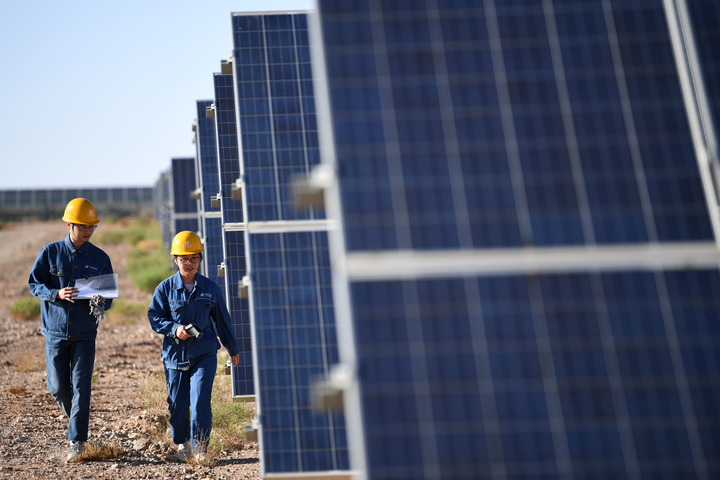 光伏电站工作人员在甘肃省金昌市华能集团西坡光伏电站现场巡检(2022年6月13日摄)。新华社记者 陈斌 摄