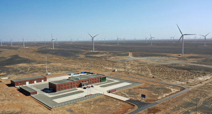 这是甘肃省酒泉市境内的风电基地(2022年4月16日摄,无人机照片)。新华社记者 陈斌 摄