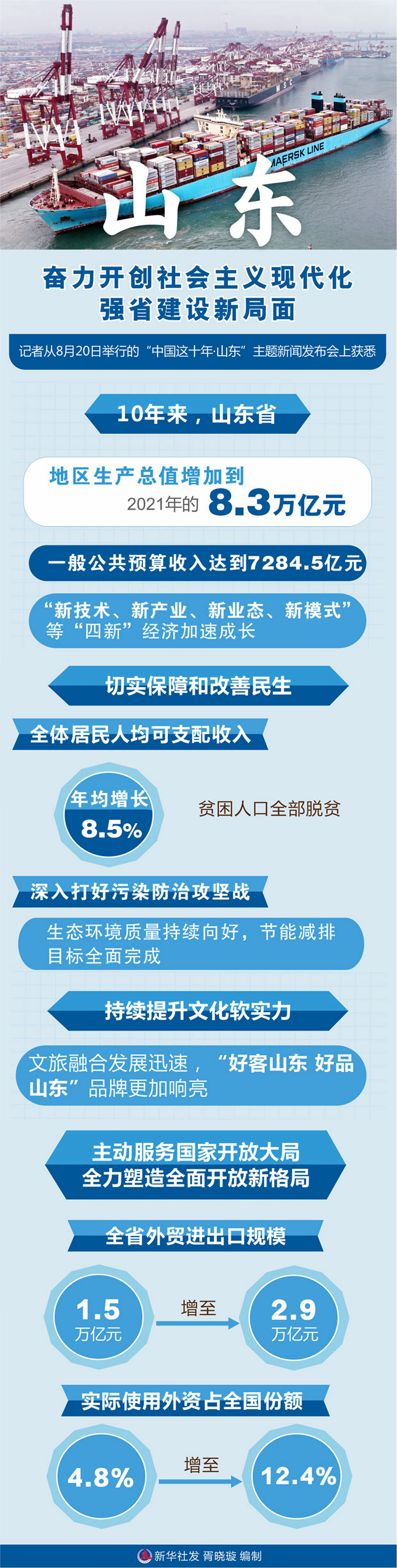 新华社济南8月20日电(记者孙晓辉)记者从20日举行的“中国这十年·山东”主题新闻发布会上获悉,党的十八大以来,山东深入学习贯彻习近平总书记重要指示精神,踔厉奋发新时代,不断筑牢高质量发展基石,奋力开创社会主义现代化强省建设新局面。