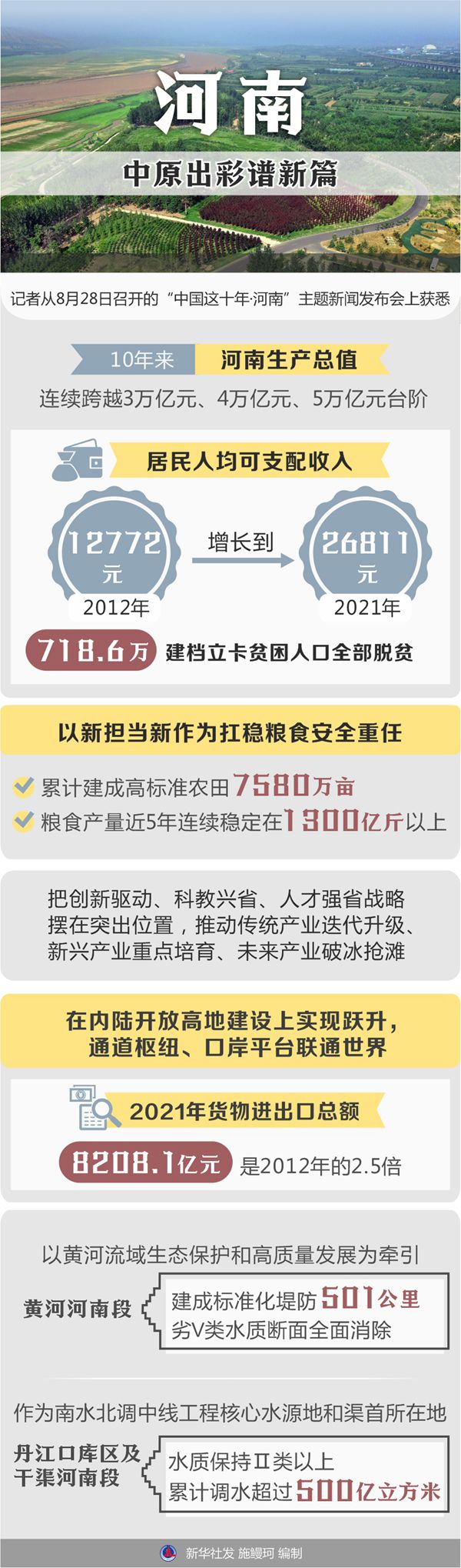 10年来,河南生产总值连续跨越3万亿元、4万亿元、5万亿元台阶,居民人均可支配收入从2012年的12772元增长到2021年的26811元,718.6万建档立卡贫困人口全部脱贫。