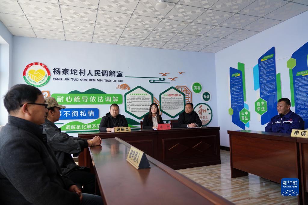 律师甄彩丽(中)在河北唐山滦州市茨榆坨镇杨家坨村人民调解室内为群众解答法律问题(2021年4月18日摄)。新华社记者 牟宇 摄