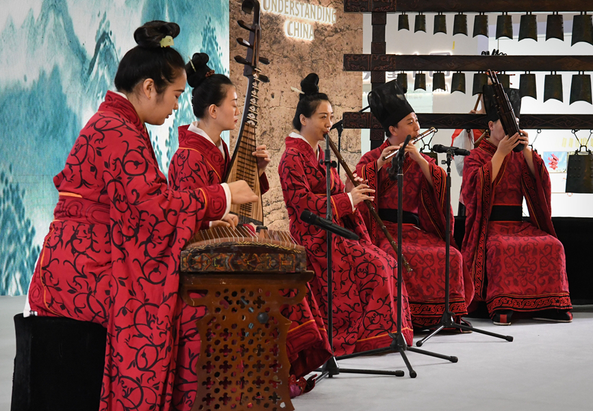 河南博物院华夏古乐团的演员在郑州国际会展中心演奏(2022年9月1日摄)。新华社记者 李安 摄