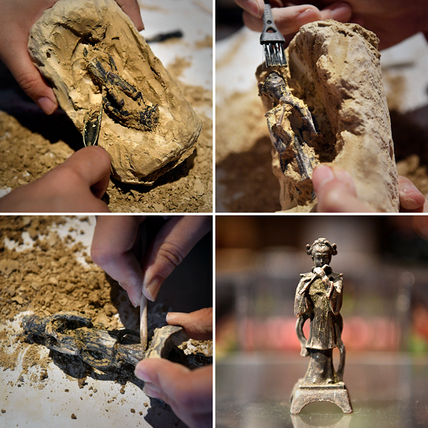 这是河南博物院推出的“考古盲盒”的“挖宝”过程(拼版照片,2022年5月17日摄)。新华社记者 李安 摄