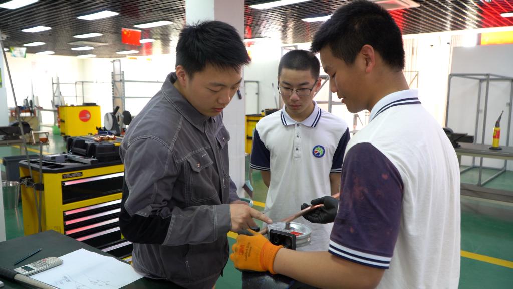 4月12日,在安吉技师学院的教学车间里,杨应政(左一)正在手把手教授学生如何做好规定角度的钢管煨弯工艺。新华社记者李涛 摄