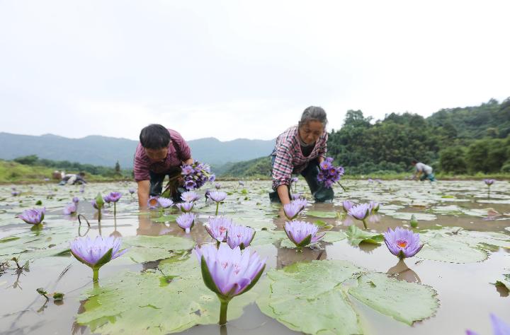 2022年6月28日,在贵州省赤水市宝源乡玉丰村,村民在采摘香水莲花。近年来,贵州省赤水市宝源乡采取“党支部+合作社+农户”模式,引导农民种植集观赏、药用、食用为一体的香水莲花,带动农民增收,助力乡村振兴。新华社发(王长育 摄)