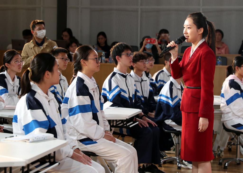 2021年10月25日,张欣怡在为上海中学的学生讲述革命文物的故事。新华社记者 刘颖 摄