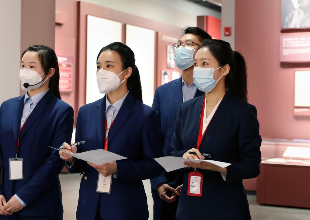 6月29日,张欣怡(左一)与中共一大纪念馆的宣教专员们在馆内进行讲解演练。新华社记者 刘颖 摄