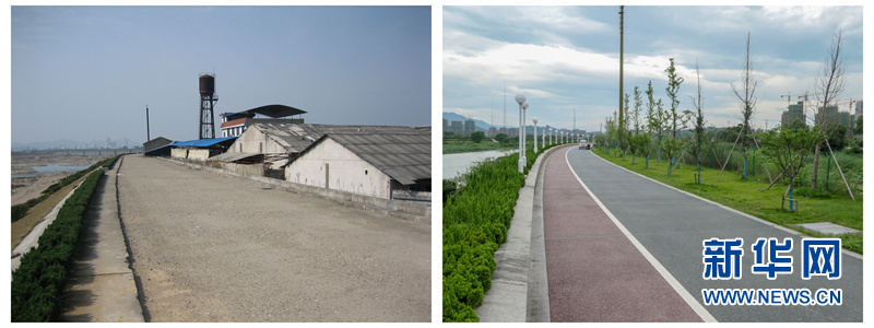 龙泉宝溪乡溪头村,活水进村公园建设前后。新华网发