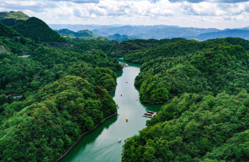 5月2日,游客在贵州省正安县九道水景区乘船观光(无人机照片)。新华社记者杨文斌摄