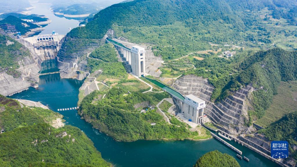 500吨级标船从遵义市构皮滩水电站通航工程下游引航道驶入第三级承船厢(2021年6月22日摄,无人机照片)。新华社记者 陶亮 摄