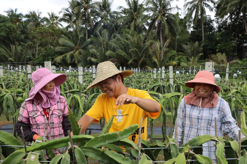万宁市长丰镇七甲村村民在火龙果基地修剪枝条。新华社记者房宽摄