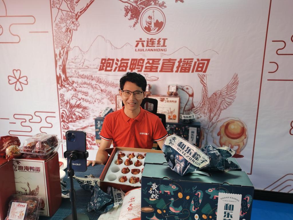 六连村食品厂负责人莫泽锦通过网络直播销售咸鸭蛋。 新华社记者赵叶苹摄