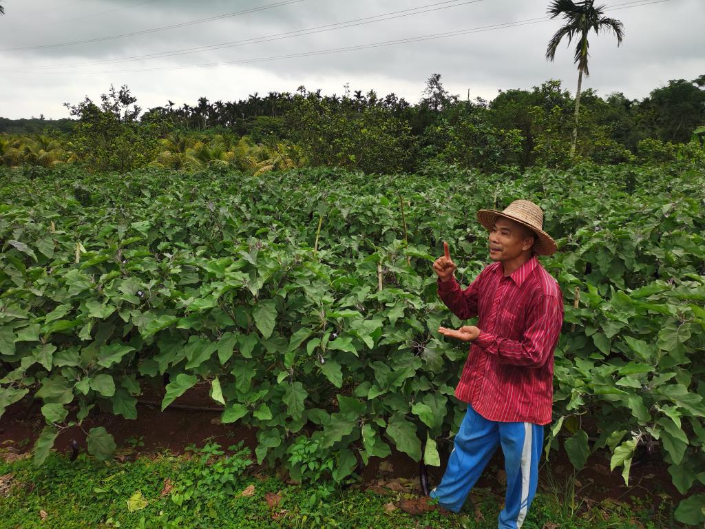 海口市琼山区道崇村村民王统奋在介绍他种植茄子的秘诀。新华社记者赵叶苹摄