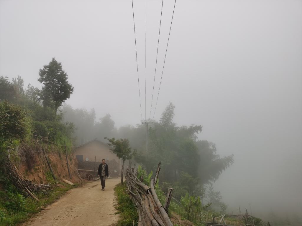 5月11日,田帮根走在自家门前的小路上。虽然已是中午,山里依然被大雾笼罩。(新华社记者 陈尚营 摄)
