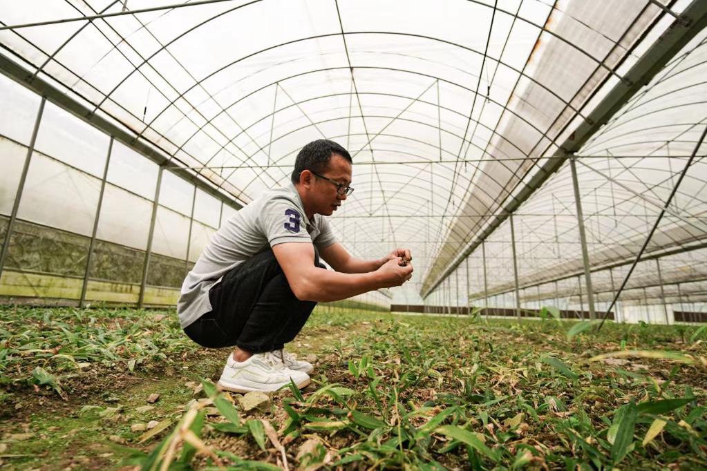 叶茂正在查看黄精长势。新华社记者朱高祥摄