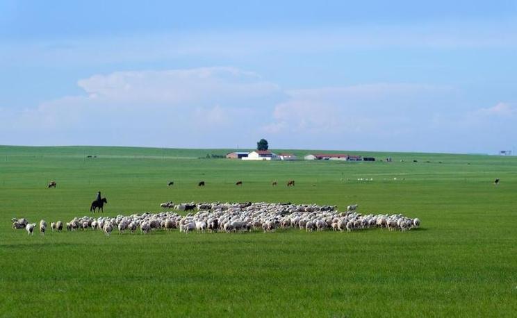 内蒙古锡林郭勒盟乌拉盖管理局境内的草原上,牧民在放羊。新华社记者贾立君 摄
