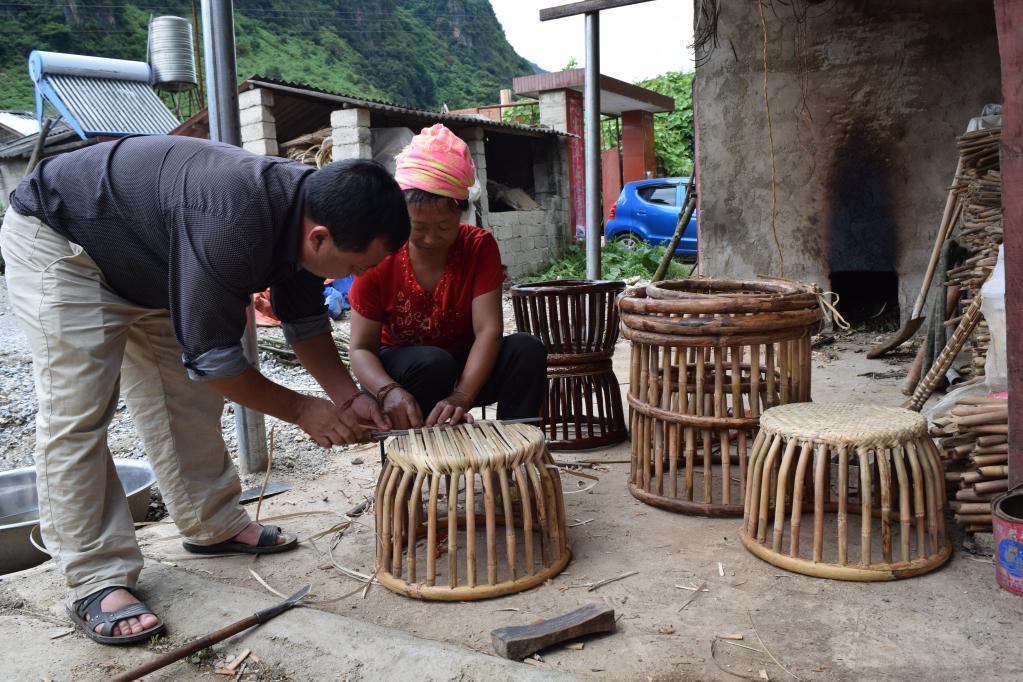 云南耿马县勐撒镇翁达村党总支书记俸绍春指导群众编制藤蔑鼓凳。(受访对象供图)