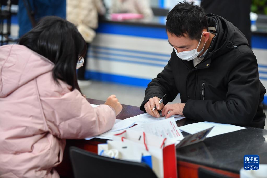 1月28日,在湖南省长沙市人力资源市场,求职者(右)在填写应聘信息表。新华社记者 陈泽国 摄
