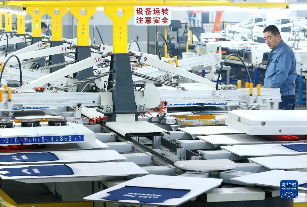 山东省青岛市即墨区青岛华信印花有限公司的工人在智能印花生产线上生产出口产品(2023年3月14日摄)。新华社发(梁孝鹏 摄)