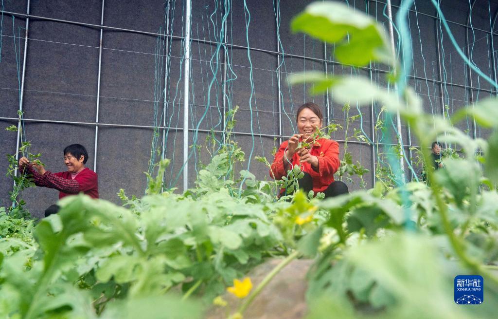 农户在河北沧州渤海新区黄骅市一处农业科技示范园为西瓜秧整枝(2023年2月11日摄)。新华社记者 骆学峰 摄