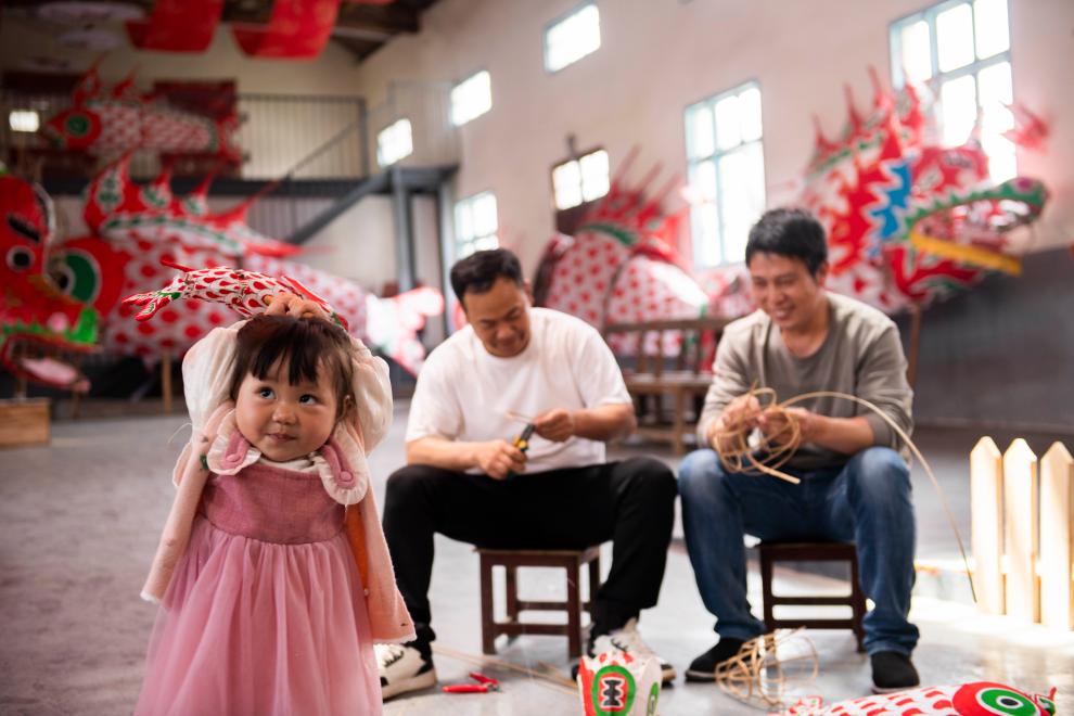 小朋友在安徽省黄山市歙县溪头镇汪满田村鱼灯工坊内玩耍(5月10日摄)。新华社记者 傅天 摄