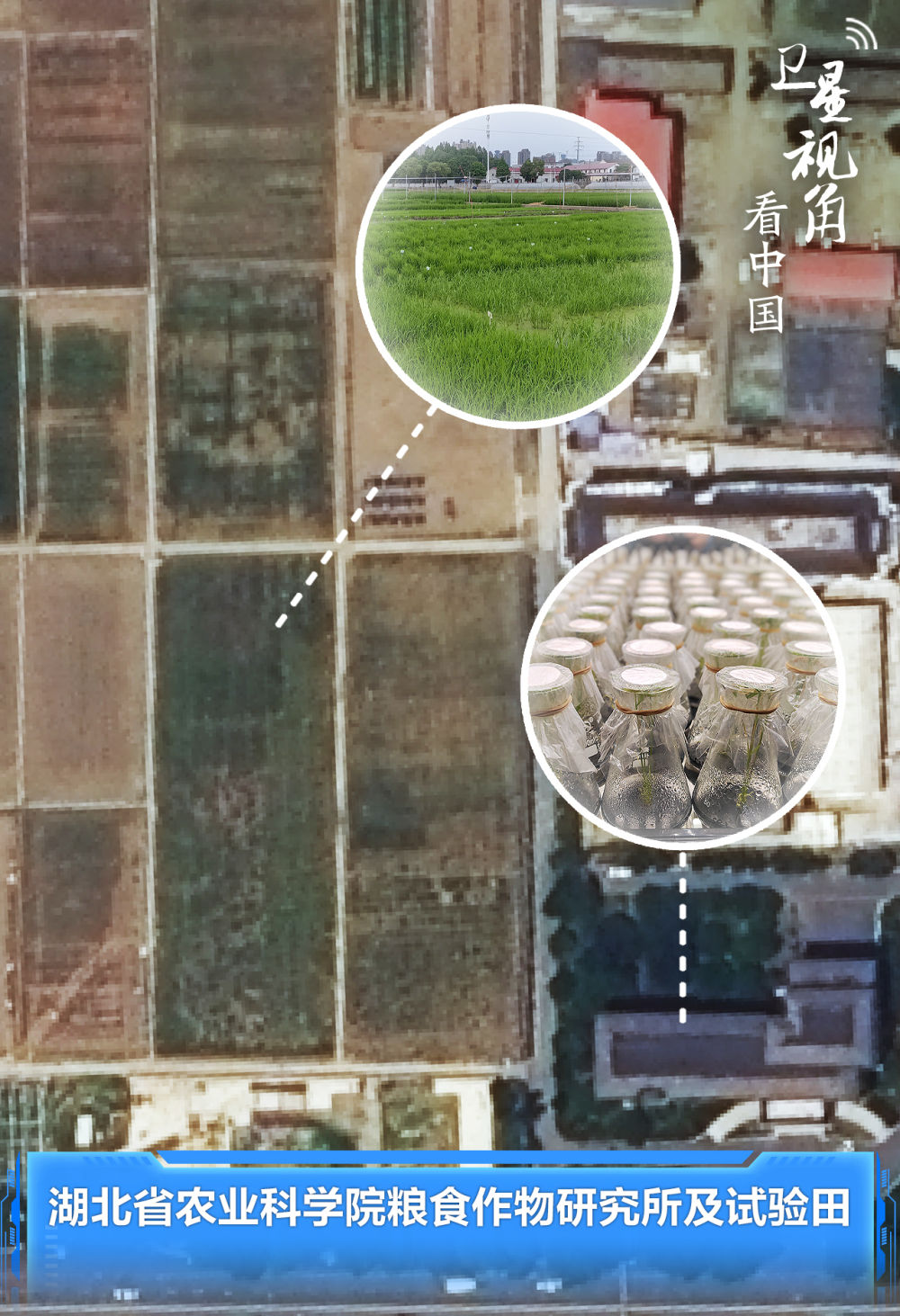 图为湖北省农业科学院粮食作物研究所(右下角建筑)及试验田(左侧农田)。科研人员选育的产量高、品质优、抗性强的作物新品种正在田间试验。