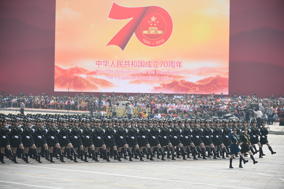 10月1日上午,庆祝中华人民共和国成立70周年大会在北京天安门广场隆重举行。这是女兵方队。新华社记者 李尕 摄
