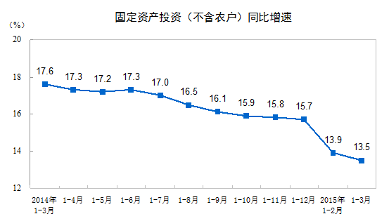 作者:来源:Wind资讯4月15日,统计局公布,2015年1-3月份,全国固定资产投资(不含农户)77511亿元,同比名义增长13.5%(扣除价格因素实际增长14.5%),增速比1-2月份回落0.4个百分点。从环比速度看,3月份固定资产投资(不含农户)增长1.04%。