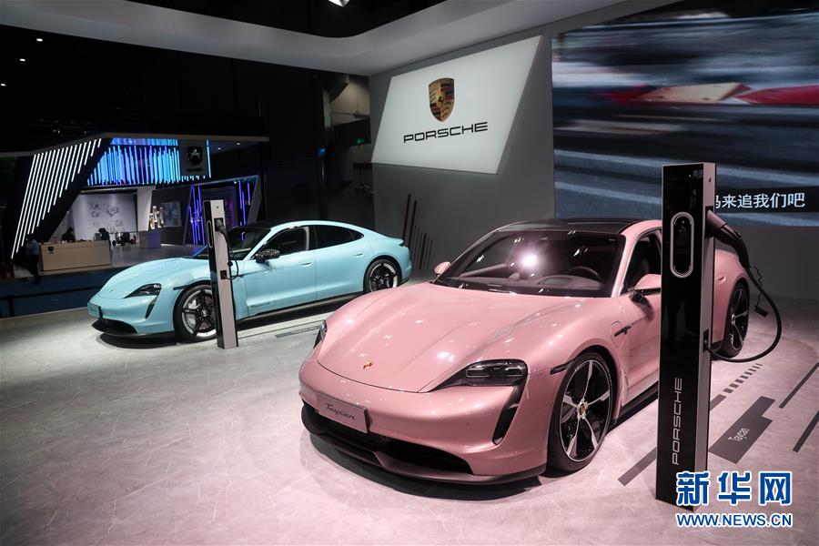11月6日在进博会汽车展区拍摄的保时捷电动汽车。 在第三届中国国际进口博览会上,多个品牌展示的新能源汽车成为参观者关注的焦点。 新华社记者 丁汀 摄