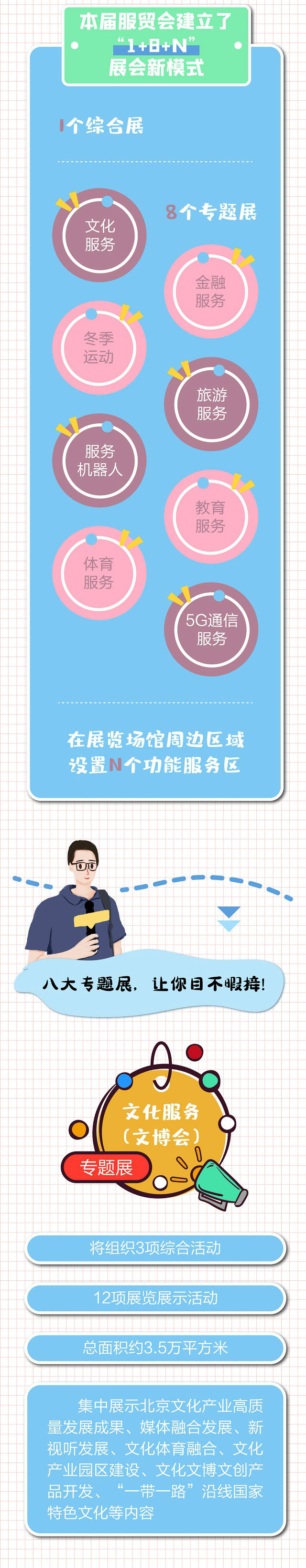 本届服贸会整合了北京文博会、旅博会、金博会、冬博会、机器人大会等重要展会和内容,建立了“1+8+N”新模式。“1”是综合展区,包括序厅、公共卫生防疫专区、国别和省区市专区及服务贸易十二大领域企业专区,集中展示国内外服务贸易发展最新趋势、最新技术、最新产品,以及中国解决方案等;“8”是八个行业专题展,文化服务、金融服务、冬季运动、旅游服务、服务机器人、教育服务、体育服务、5G通信服务等专题展将集中亮相服贸会;“N”是因地制宜设置若干功能服务区,为参展客商提供洽谈、体验、餐饮等配套服务。